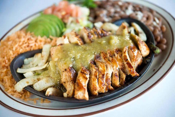 Chunks of lean pork cooked juicy inside and crispy outside. Served with Mexican rice, beans, guacamole, pico de gallo and warm tortillas.